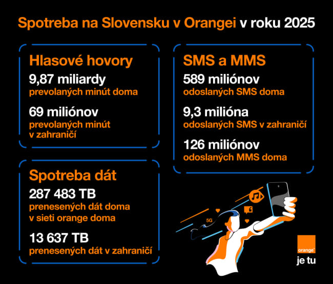 Už dávno neplatí, že telefón slúži len na telefonovanie. Spotreba dát v našej sieti láme rekordy. Celkovo ste v sieti Orange v roku 2025 preniesli neuveriteľných 287 483 TB dát. V porovnaní s minulým rokom je to nárast až o 34 %.