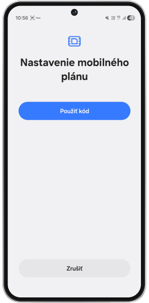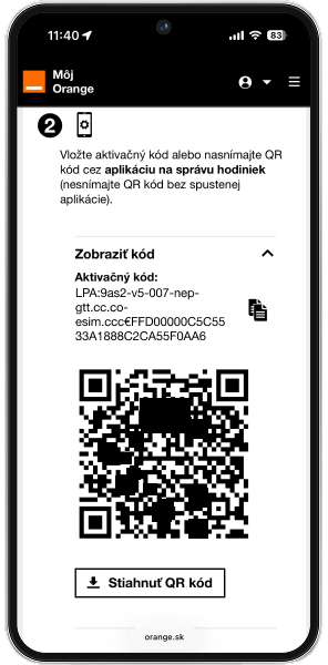Naskenujte zobrazený QR kód (prípadne si ho uložte ako obrázok a nahrajte z galérie) alebo kód zadajte ručne. Po potvrdení sa služba aktivuje a hodinky sa pripoja k paušálu.