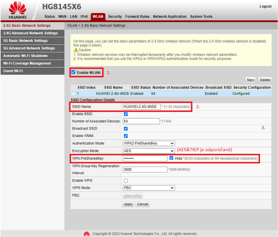 - WPA PreSharedKey: zvoľte vlastné heslo